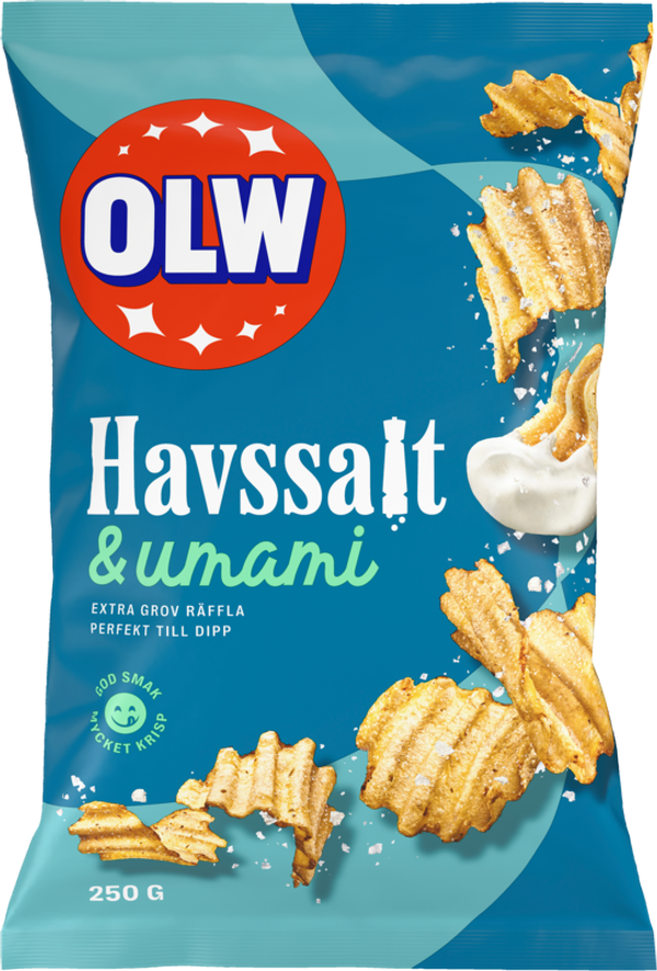 Krispiga chips med smak av Havssalt och umami. Det perfekta chipset för dipp då den milda saltningen tillsammans med umami förstärker upplevelsen av dippen. Den grova räfflan ger extra mycket smak och dipp till varje tugga.