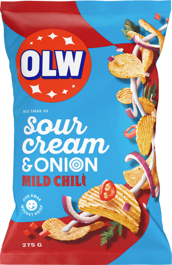 Goda och krispiga Sourcream & Onion Chili chips från OLW. Vi använder oss av naturliga ingredienser och den allra finaste potatisen. Chipsen är finräfflade och har en smak av syrlig gräddfil, lök och persilja samt en mild ton av chili. En vegansk upphottad chipsklassiker!