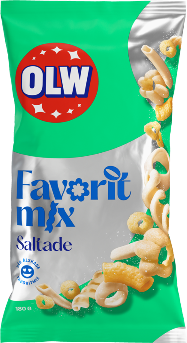 Favoritmix från OLW – en riktig klassiker! Skruvar, pinnar, ringar och figurer. Favoritmix innehåller 6 olika figurer av spröda, saltade snacks gjorda av majs och potatis. Det här är den perfekta starten på en riktigt bra kväll.
